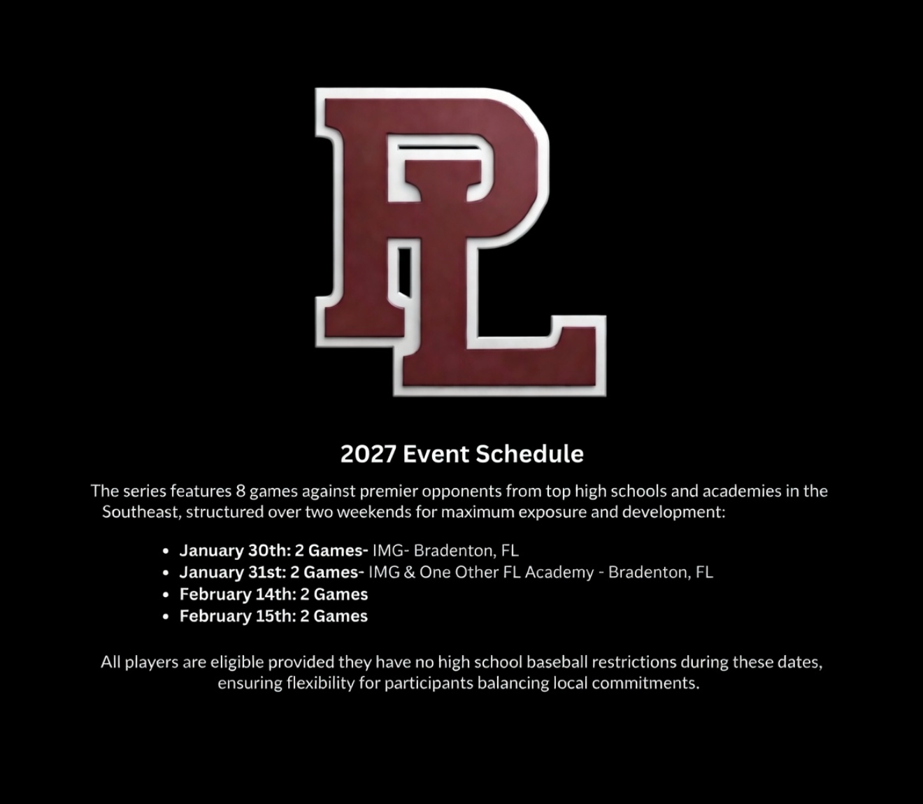 Any players that are Seniors or Juniors that aren’t playing high school baseball during these events are eligible to play. Also homeschool players are eligible.